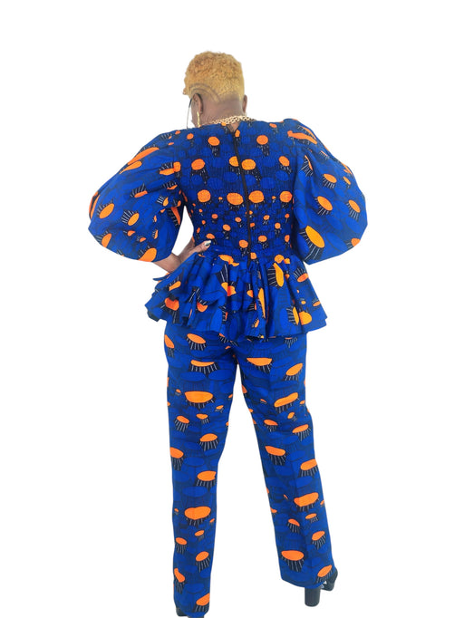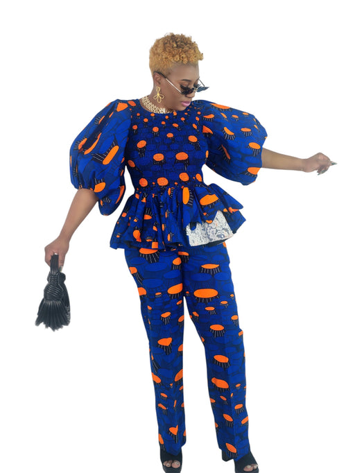 View full detailsBold Elegance Smocked Top & Straight Pants Set – Blue/Orange Ankara Step into style with our Bold Elegance two-piece Fife set, featuring a beau...