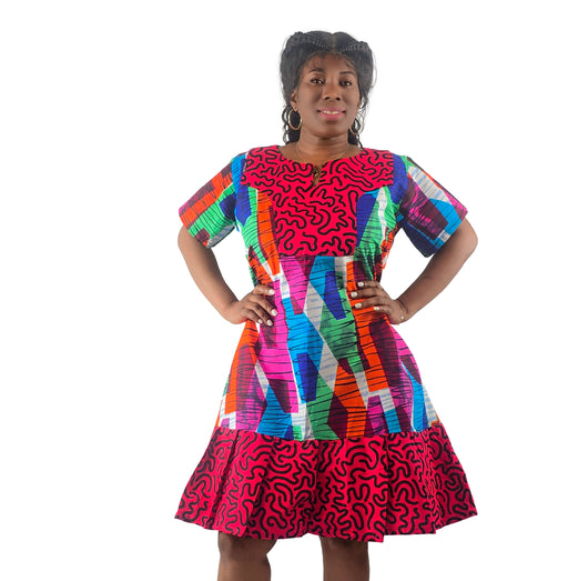 Make a vibrant statement with the Favor Dress, a playful and bold piece made from rich Ankara fabric. Featuring a colorful rose pattern combined wi...