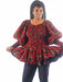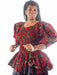 Add bold color to your wardrobe with this vibrant smocked Ankara top. Designed with a flattering stretch smocked bodice and dramatic puff sleeves, this top flares into a playful peplum that pairs perfectly with jeans, skirts, or trousers. The rich red, black, and gold leaf print brings a modern twist to traditional African fashion, perfect for casual and dressy occasions.