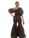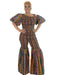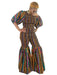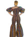 Make a vibrant entrance in this eye-catching smocked jumpsuit. Designed with a stretchy, smocked bodice for a flattering fit, it features bold multicolor vertical stripes, elegant off-shoulder puff sleeves, and dramatic wide-leg flares. Perfect for parties, special events, or standing out in everyday style, it is made with breathable fabric for all-day comfort and effortless movement.