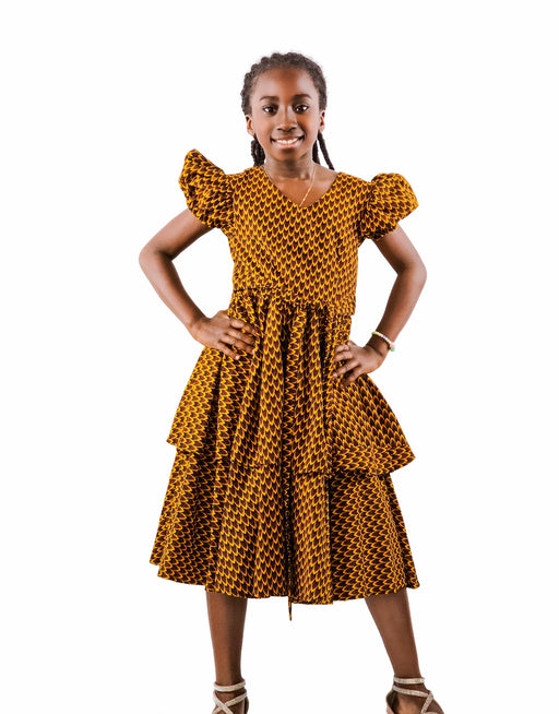 Let your little one shine in our Mini Majesty Ankara Dress, crafted from rich, vibrant Ankara fabric with a golden-yellow and black scale-like patt...