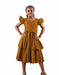 The Mini Majesty dress features a golden-yellow and black Ankara print with puff sleeves and a flared tiered skirt, perfect for twirls and special moments.